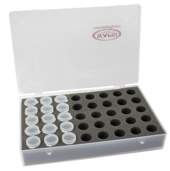 The Wapsi UTC Vial box is ideal for beads, hooks, eyes and any small fly tying material that otherwise would be difficult to organize. Each box comes with 40 pop-top vials. A description of the vials contents can be easily written on the top with a permanent marker. The vials can hold hooks, beads, and materials of all sorts. By simply drilling a hole in the top of the vial it can dispense chenille and